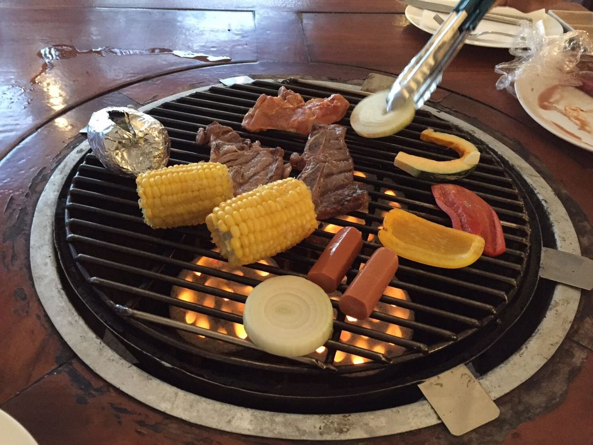 ファイアーショウを見てみたい方におすすめです。パフォーマーの方が「しもしも~?」とか日本の新しいお笑いのネタを仕込んでいます。バーベキューは十分な量です。後方にサラダやキムチなどが置いてあります。
