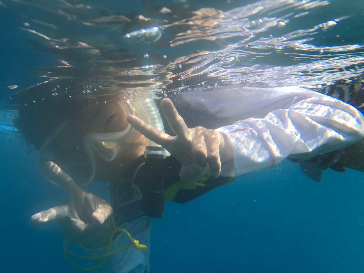 魚がとてもたくさんいてとてもきれいです。そして、昨年参加した時には会えませんでしたが、今回はウミガメに会うことができました。人懐っこく、何回も近づいてきてくれました。