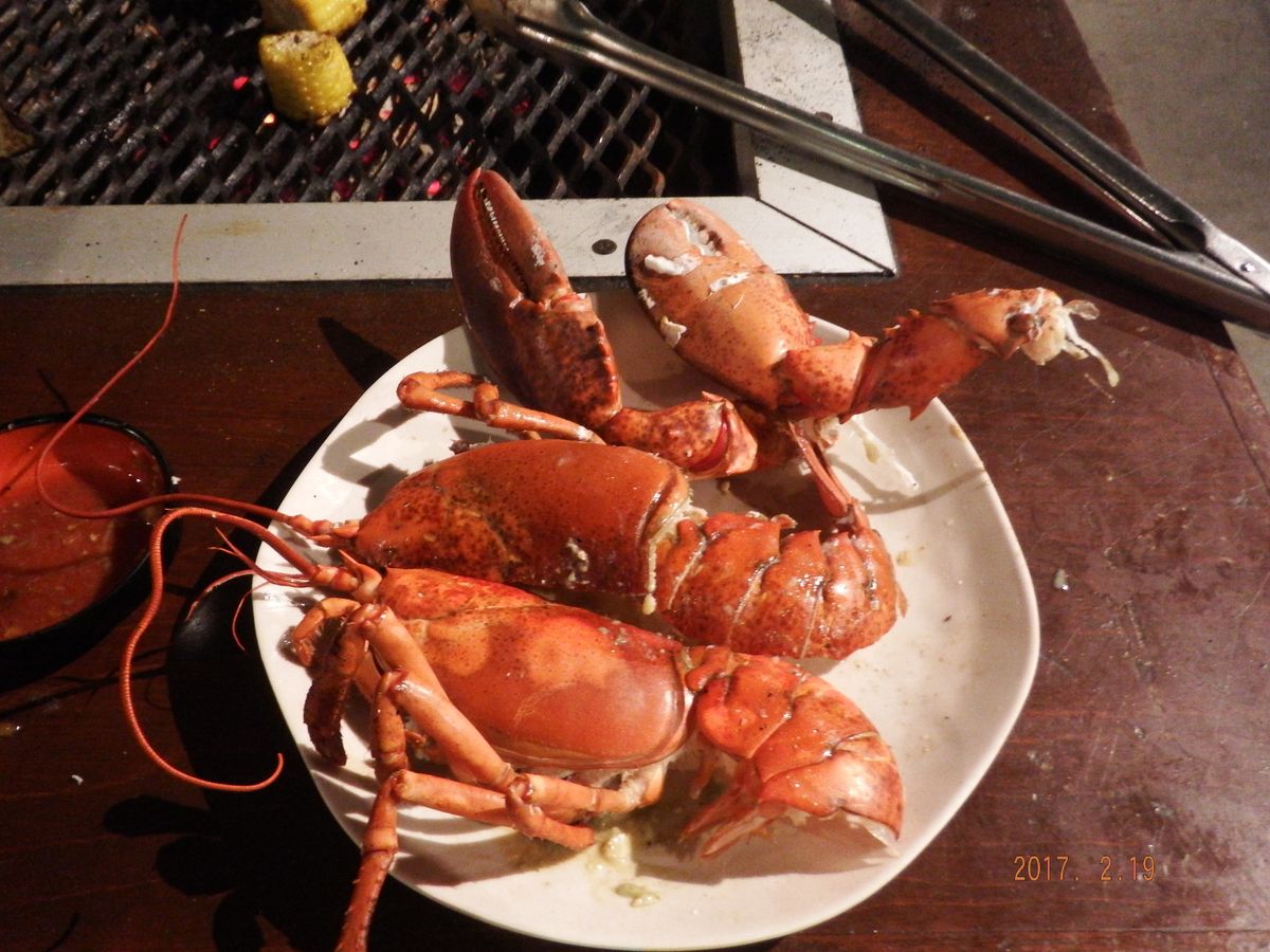 まだ動いている活きロブスターが丸ごと2匹。ほっと一安心。このまま焼いても食べれないので半分にカットしてくれと言うと、何やら言って戻っていきました。待てども待てども私たちのロブスターは戻って来ない。しかし、しばらくして戻ってきました。きれいに焼いてくれて1/2カット。ミソもきれいに残っていました。至福の瞬間です。隣の席ではロブスター丸ごと焼きでお店のスタッフがハサミでズタズタにカットしておりました。ああゆう食べ方もあるのかな?