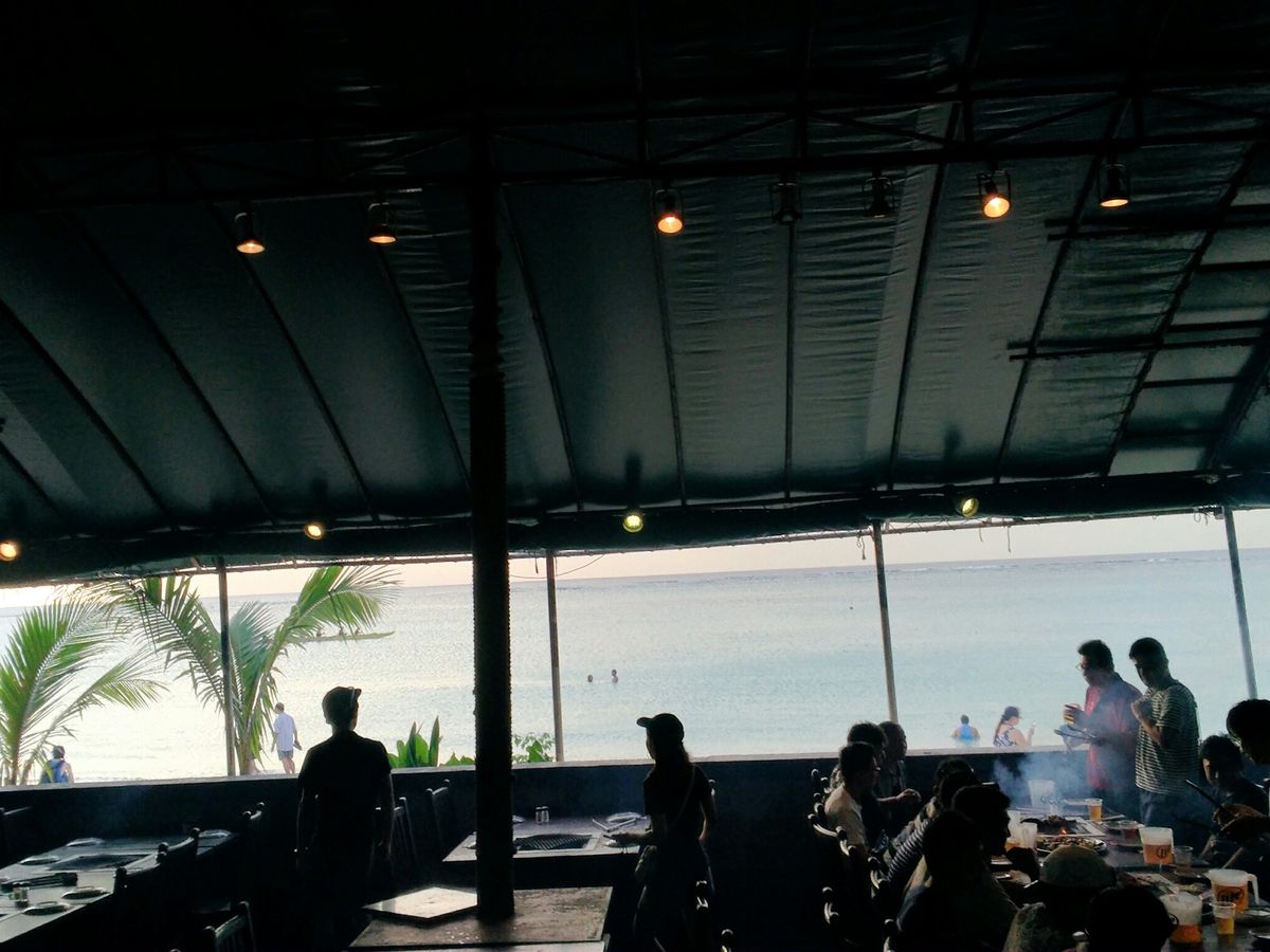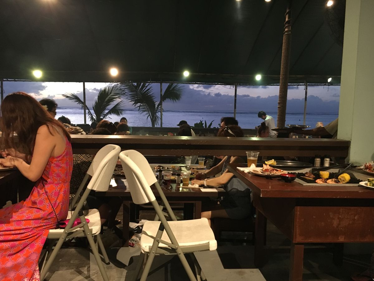 日本で予約をして参加しました。宿泊先のホテルまで迎えがきてくれました。案内された席はテラスの海から1番離れた場所でした。その日の天気がくもりということもあり、想像していた綺麗な夕日はみることはできませんでした。サラダ、ぱん、ごはん、味噌汁、パイナップルがセルフサービス食べ放題です。お肉もボリュームがありおいしかったです。ドリンクは店員さんがどんどん席にきて継ぎ足してくれます。外で気持ちよい風を浴びながらバーベキューを食べたい方はタモンから近い好立地でおすすめです。帰りも送ってもらおうと思いまっていましたが、次の時間の予約の人でごちゃごちゃしていて送ってもらえず、自分で帰りました。