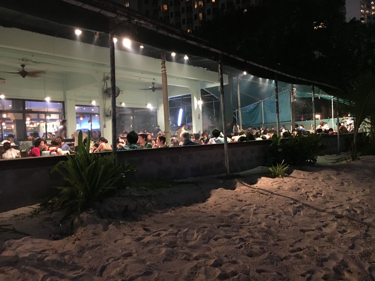 海はすぐ目の前で、席からそのまま砂浜に出られます。お客さんは比較的に若者が多くとても賑やかで夏の雰囲気を味わいたい人にはもってこいのお店だと思います。