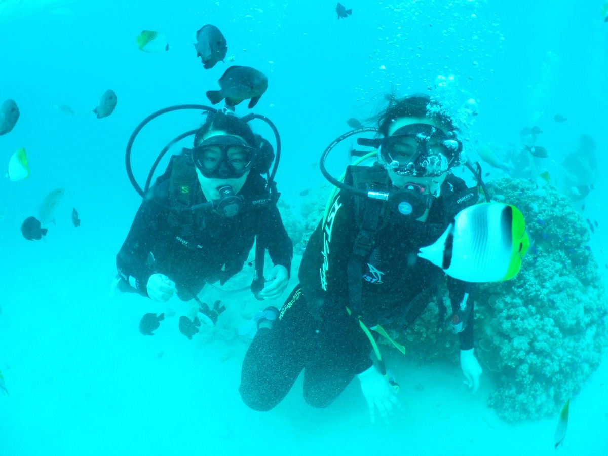 何度か体験ダイビングは経験していたのですが、是非Cカードを取得したいと思い、大学生の娘とふたりで参加しました。一日目は午前中はビーチで2ダイブ、午後はビデオやテキストでお勉強。私は何十年ぶりのテストに緊張しましたが丁寧に教えて頂いて無事学科は合格出来ました。二日目は自分で器材のセッティングをしてビーチで2ダイブ。2ダイブ目は体験ダイビングのグループと一緒でしたが、持参したデジカメで撮影も出来ました。一日目はミキさん、二日目はナオコさんが担当でしたがお二人共話しやすく素敵な人で、本当に楽しい2日間でした。次回はファンダイブでまた来たいです。