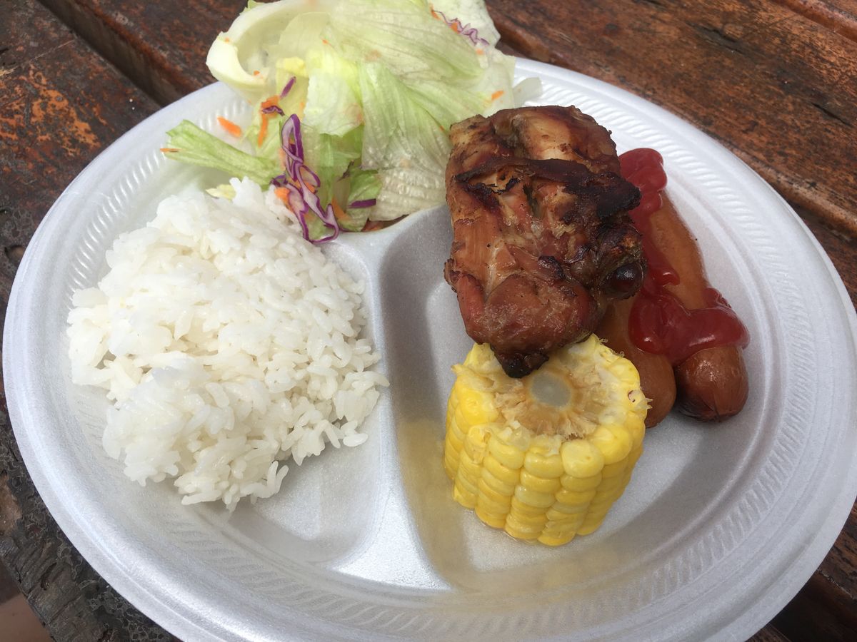 ランチはチキンとポークのBBQとカレーライスとムースっぽいデザートで味は美味しく良かったのですが、ハエが多量に飛んできて皆手で払いながら食事していました。自然の物だから仕方ないのでしょうが、ここだけは難点でした。