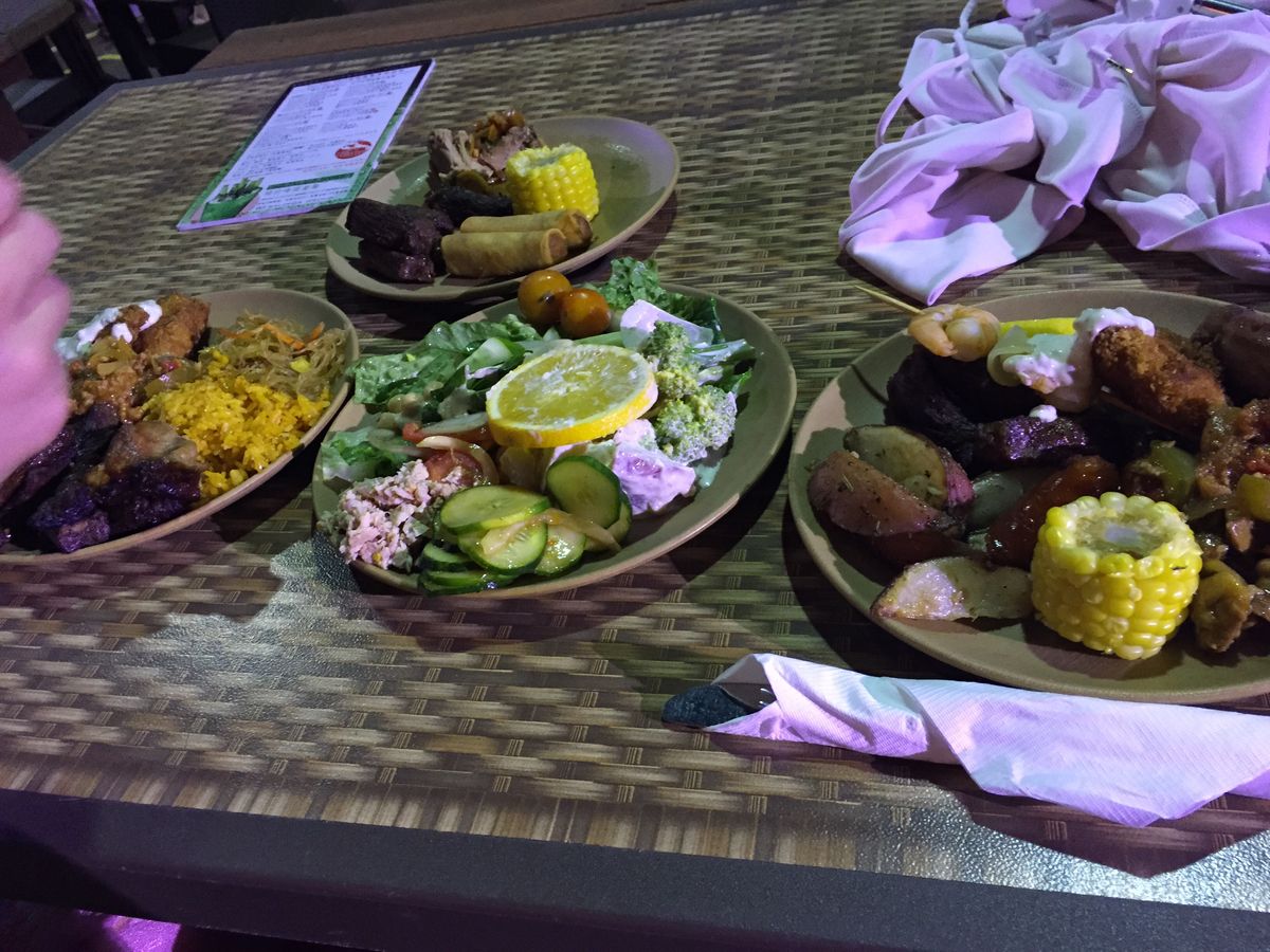 席に着いて、すぐに飲み物を尋ねられました。フリーのサラダを取りに行って戻ると、大皿に食材が盛り付けられて、置かれていました。ロブスター、カニ、チキン、ステーキ、牡蠣、野菜など、たくさんありました。