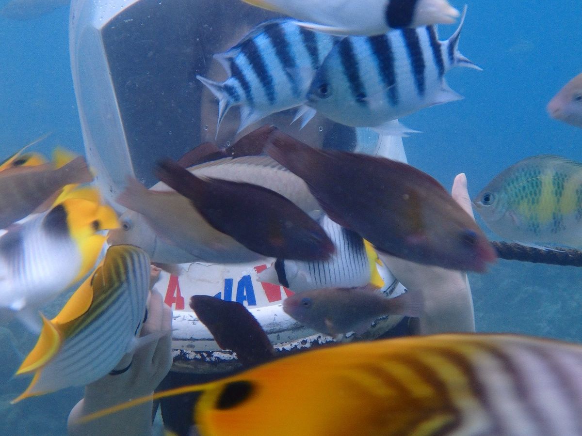 被るだけなのに髪の毛が濡れないなんて仕組みが分からなかったのですが、やってみて納得。大きなヘルメット?の重さが40キロですが水中では4キロと重さも感じないし水中ギリギリでインストラクターの方がこれまた水面ギリギリにヘルメットを持ち、そこに頭を入れる感じだったので40キロを体感する事も無かったです。水中カメラを持って行ったので魚を撮ったりとても楽しくて終わりたくなかったです♪インストラクターの方々もノリが良くまた利用したいです!