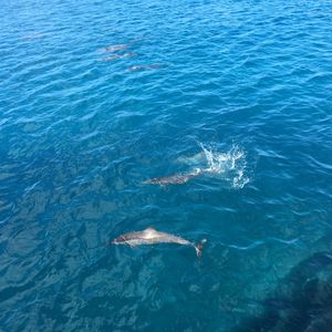 肝心のイルカですが、船がゆっくり進み。。もしかしたら、逢えない日もあるのかなと不安になっていると船と一緒にトビウオが飛んでいて、これが幸運の始まりでした。