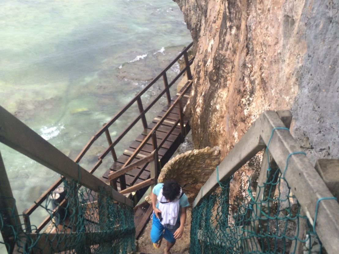 お迎えの車を降りてからは、海沿いの崖の下を歩いてビーチまで行きます