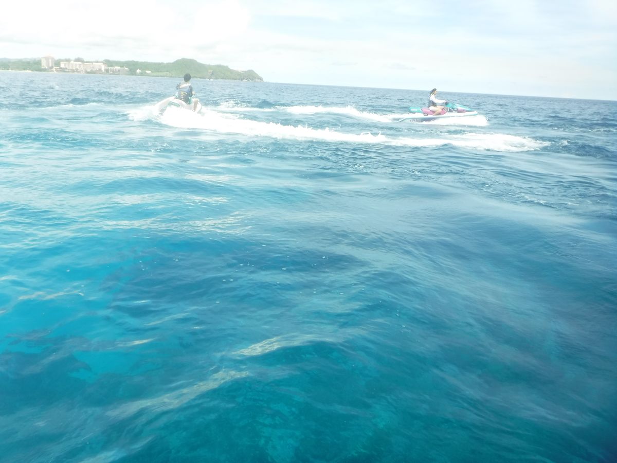 私(父親)と中一の長女。高二の長男が、各1台のジェットスキーを借りて60分のツアーに参加しました。7日間、グアムに滞在し、スキューバーなど色々と体験しました。帰国時に、子ども達に何が一番楽しかった?と聞くと、このジェットスキーのツアーでした。考えてみれば、中学、高校性にとって、初めて自分たちで運転する乗り物だったので楽しかったのだと思いました。