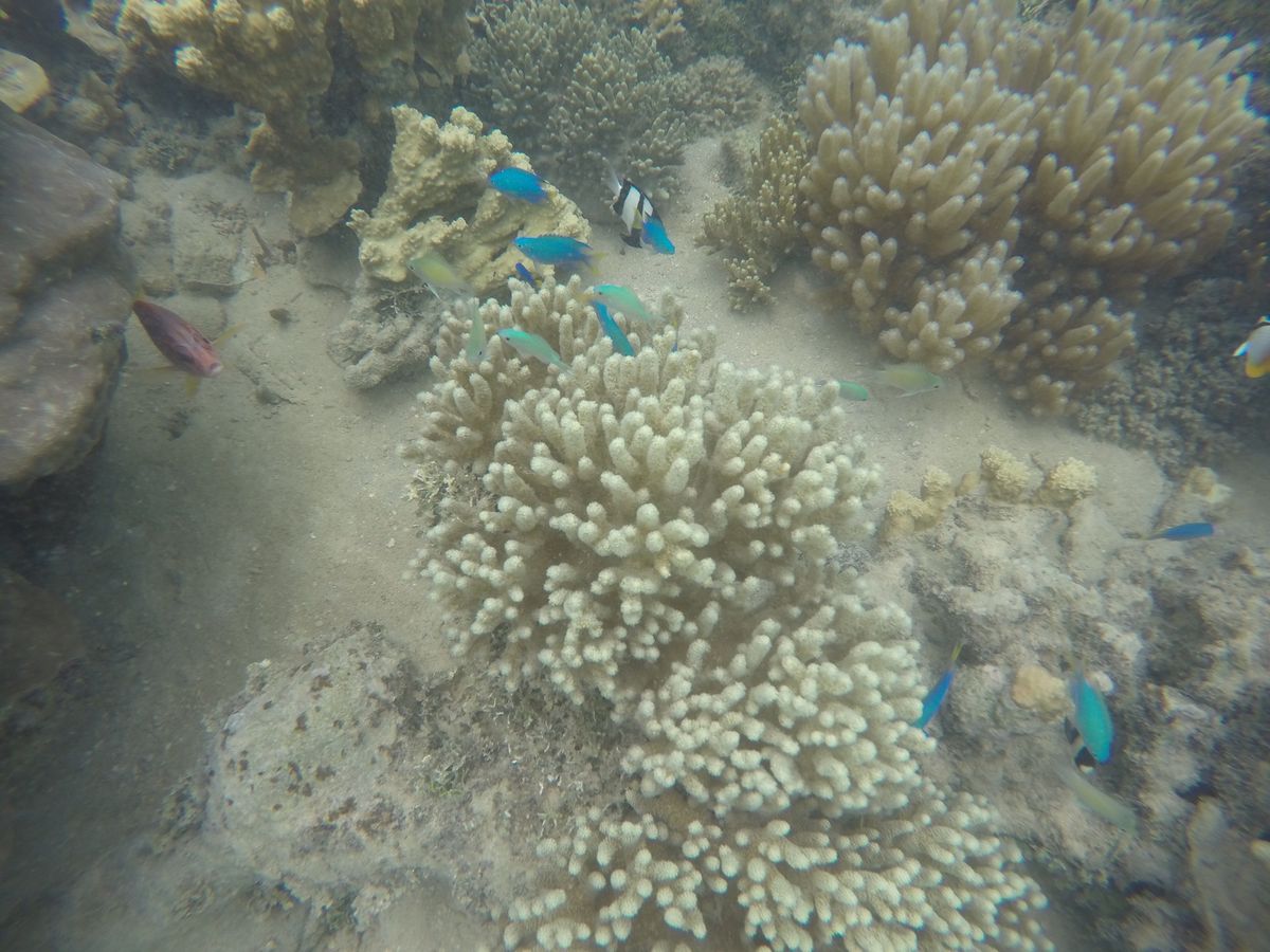 カラフルな魚はよってくれるのではなく、攻撃してくるので、気を付けて。今となってはその攻撃もいい思い出。あまりに印象的だったので、調べたら、ムラサキモンガラって魚らしい。