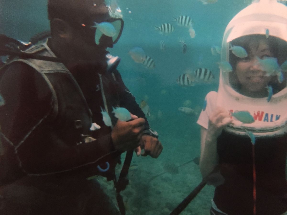 シュノーケルもやったことのない60歳目前の私にとって、初アクアウォークは勇気のいる挑戦でした。しかし、現場のスタッフのみなさんはとても親切で、丁寧に付き添って下さったので不安は直ぐに消え去りました。気圧の変化も、唾を飲めば対応でき、可愛い魚達と楽しく戯れることができました。海から戻ると、飲み物は飲み放題。常にスタッフのみなさんが声をかけて下さり、体験後も快適に過ごすせました。参加して本当に良かったです!