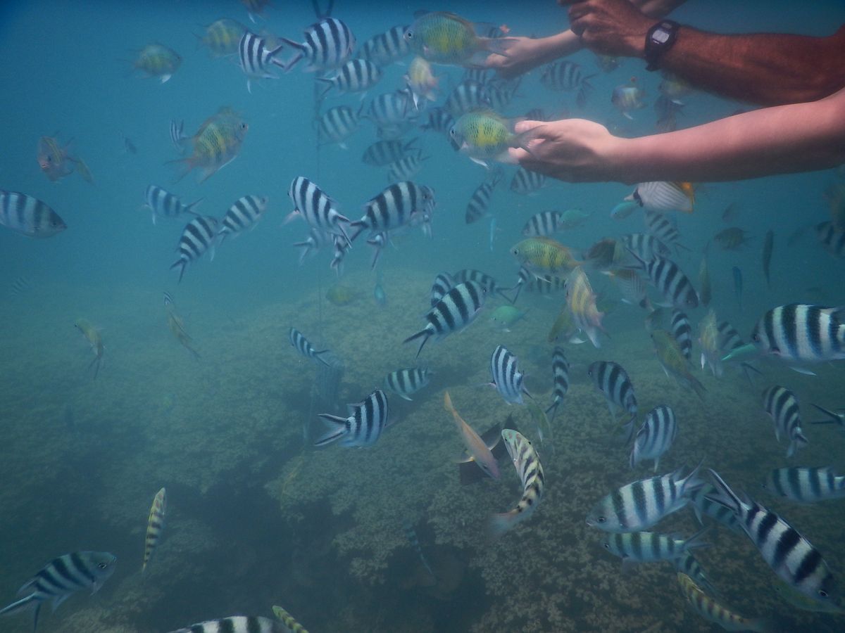 スタッフの方がヒトデを取ってきてくれたり、パンを投げて魚が寄ってきたり。