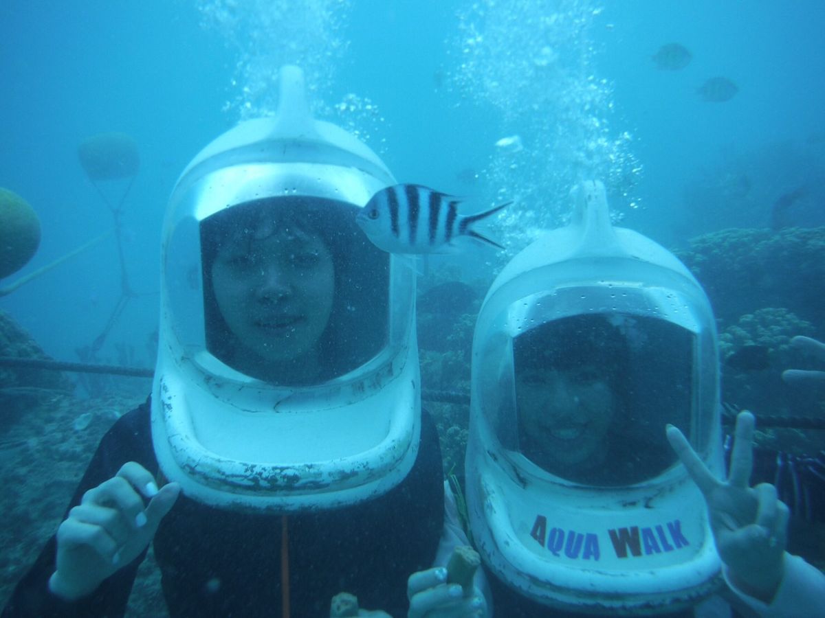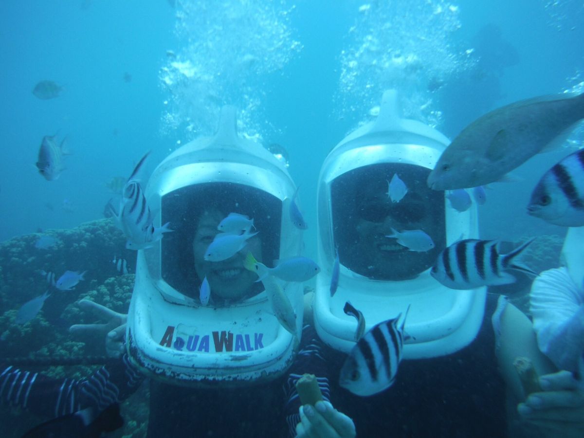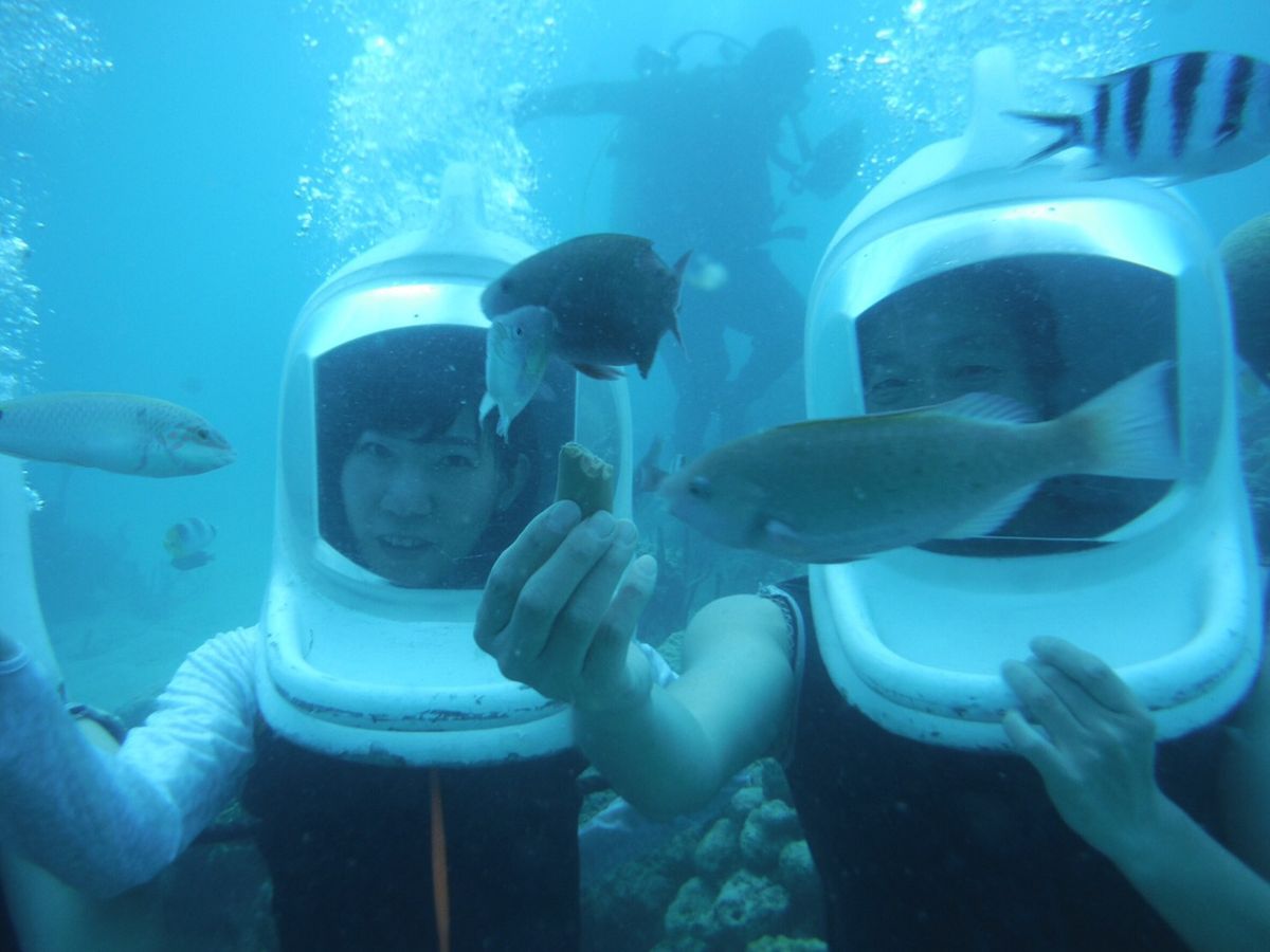 私、私の母、友人、友人の母の、20代と60代の女性4人で参加しました。パラセーリングは穏やかで気持ちよかったです。バナナボートはイルカと並んで走れました。イルカウォッチング&シュノーケルでは、船酔いのためか嘔吐している方がいたので酔い止めを飲むことをお勧めします。アクアウォークがウエットスーツが半ズボンだったのでサンゴにつまづいたときにけがをしてしまいましたが、すぐにスタッフが薬と絆創膏で処置してくださいました。