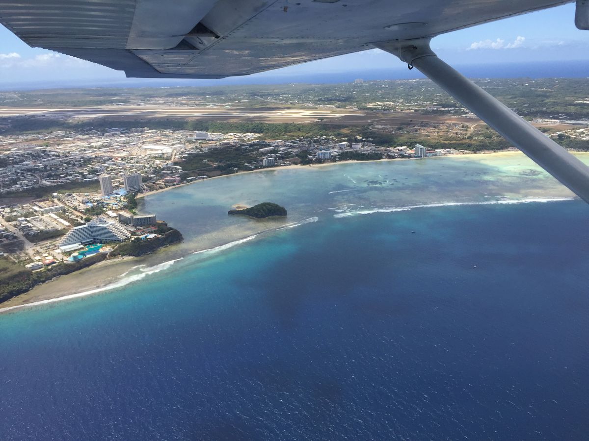 となり席に教官はすごく丁寧に操縦サポートしていただきました、子供達はとても真剣な姿を見ながら窓外からのグアムの観光最高です。