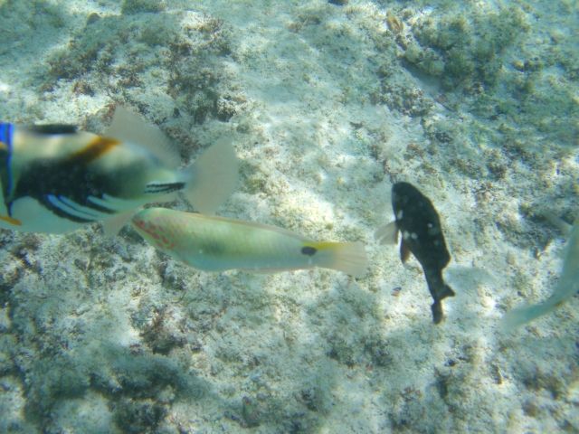 参加者は我々の他には小さな子供連れの4人のファミリーのみ。2組での貸しきり状態です。サンゴがあるビーチなのでマリンシューズと、シュノーケリングのセットを借りました。午前中はシュノーケルで海の中をのぞいたり、魚の餌やり(パン)をしたりしました。特に餌やりはたくさんお魚が寄ってきて大興奮!とても楽しかったです。