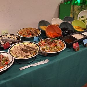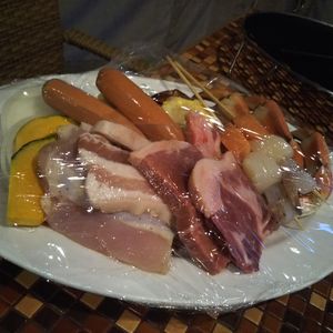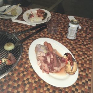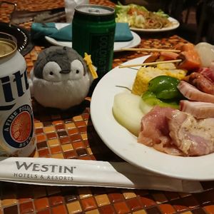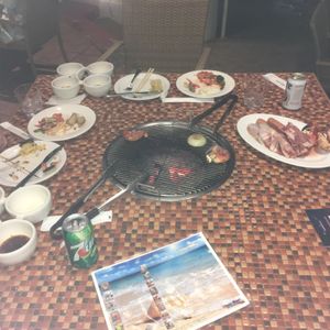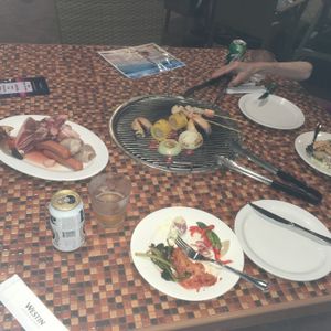 料理の内容は、ステーキ、ロブスター、エビ、チキン、野菜類が大人2名分運ばれ、自分達で好みの焼き加減で食べます。ビュッフェコーナーには、バーベキューのタレ1種類(刻んだ生の玉ねぎ入り)、白ごはん、ロールパン、味噌汁(海藻)、サラダ(トマト、きゅうり、レタス、コーン、紫玉ねぎ、紫キャベツ等)、3種類のドレッシング、パインが置いていました。飲み放題はビールとアイスティーで、少なくなると店員さんが注いでくれます。テーブルには塩コショウが置いてあります。量は充分あるので、かなり満腹になります。特にロブスターが、身が柔らかく塩加減も良く、甘みもあってとても美味しかったです!タレはつけずそのまま食べるのがおススメです。お肉は、個人的にステーキよりチキンの方が柔らかくて美味しかったです。店員さんもとても親切で笑顔で応対してくれました。子供にご飯をあげながらの食事でしたが、気づいたら飲み物が注がれていたり、火加減も気にしてくれて、至れり尽くせりで、私自身もとても楽しむことが出来ました。帰りの送迎も食べ終わった順に送迎しており、私達は食べ終わるのが遅い方でしたが、急かされることもなく本当にゆっくり過ごすことが出来ました。またぜひ利用したいです!どうもありがとうございました。