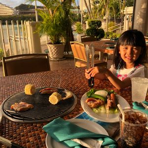 18時からの予約で10分ぐらい前に着きましたが、既に2組ぐらい待っていました。受け付け順に好きな席が選べたので、海側の席が良い方は、早めに行った方がいいと思います。席に着くぐらいには丁度夕日が綺麗に見え始めていたので、食事前にインスタ映えする写真が撮れて、娘も満足している様子でした。食事もプレートに豚肉、牛肉、鶏肉、海鮮、野菜と盛り沢山でした。小学生の娘は料金が大人の半額ぐらいでしたが、プレートには3人分同じ量でしたので、女3人には多過ぎるぐらいで、とてもお得に感じました。他にもサラダ類や惣菜やデザートが食べ放題になっており、中でもポキはマグロも新鮮で美味しかったです。ステーキソースは3種類ぐらいあり、薬味でわさびもあり、私はポン酢にわさびを付けて食べるのがあっさりして、美味しく食べれました。以前の体験談で、デザートのアイスがハーゲンダッツだったと書いてあったので、期待していたのですが、残念ながらハーゲンダッツではありませんでしたが、バニラは濃厚で美味しかったです。 食べ終わった後も、ホテルのプールがライトアップされていて、インスタ映えすると、娘が喜んでいました。二人目無料のキャンペーンもあり、お得に楽しい食事が出来ました(^^)