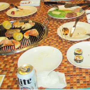 そして肝心の料理ですが。。。グアム初日の初めてのご飯が、ここは韓国??と思うようなサイドメニューにビックリしました。キムチにキンパがあり、ピリ辛マグロのポキ(これはハワイ??)と、子ども3人連れだったのですが、サイドメニューが何も食べれませんでした。メインはワンプレートにビーフ、ポーク、チキン、カニの爪、ホタテと鮭とエビの串一本づつ、ウインナー、冷凍トウモロコシ。あまり美味しくない。飲み物は飲み放題なので、ビールいっぱい飲みました(笑)アイスクリームもありましたが、チョコレートとストロベリーのみでした。