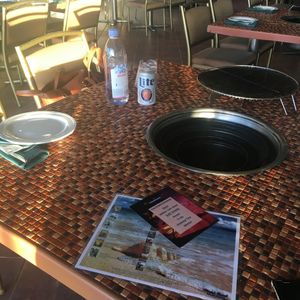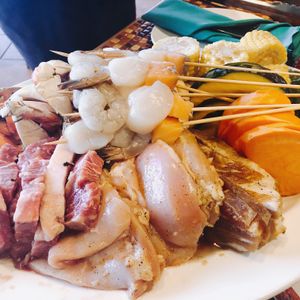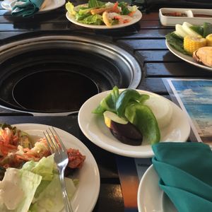 スタッフに案内され着いたテーブルはとても清潔で、スタッフの方が直ぐに肉と海鮮と野菜のセットを持ってきてくださいます。