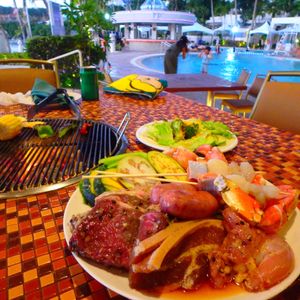 バーベキューの内容は、牛、豚、鳥どれぞれ7から80グラムの三種の肉とエビ、ホタテ、サーモンそれぞれ小さな串が1本、甘辛い、えたいにしれない味のソーセージ1本それにアメリカ特有の冷凍とうもろこしが5センチ程のもの1つあと、ドリンクとサラダやちょっとつまめる惣菜がバイキングという内容です。