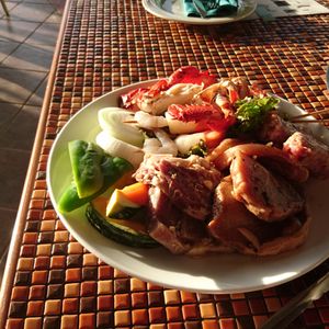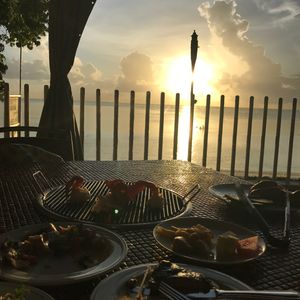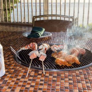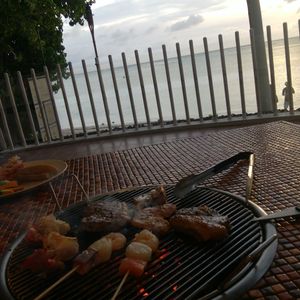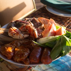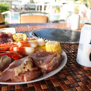18時からテラス席で、牛・チキン・牡蠣・ロブスター・蟹のBBQを予約。日差しが強く、サングラスは必須でした。バーベキューなので、暑いし灰まみれになりますが、食べ物は美味しかったです。サンセットもとても綺麗に見れます。スタッフさんはとても優しく、お願いしたら牡蠣や蟹をハサミで切って食べやすくしてくれました。