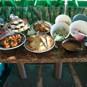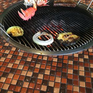 1歳児がいると、自分で焼くBBQは、大変かなと思いましたが、スタッフの方がこまめにテーブルに来て、お肉の焼き加減をチェックしてくれたり、ハサミで食べやすい大きさに切ってくれました。(子連れだったからかな?)お肉は、牛・豚・鳥の他にホタテとサーモンの串や上海蟹?や野菜もありました。旅行中は、野菜不足になりやすいので、ビッフェ方式は有り難いし、子供は、レッドライスとスープ(参加日はクラムチャウダー)に夢中でした。