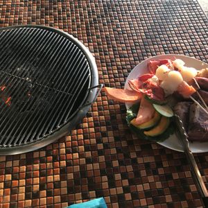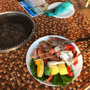 BBQはちゃんと炭火で用意されていて、内容は他の方も書いているように、豚肉、鶏肉、ソーセージに、海鮮(カニとエビ、ホタテ、サーモンの串焼き)、野菜のプレートが各席に最初に運ばれてきました。家族4人ではこれだけでお腹いっぱいになりますが、ビュッフェスタイルの食べ放題にはサラダや巻き寿司などたくさんの食材が並んでいました。