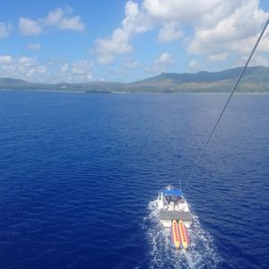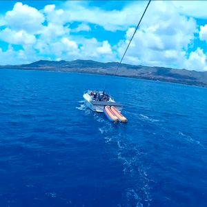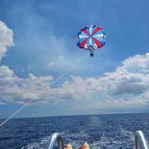 バナナボートで振り回されて!?落水のスリルを味わった後パラセーリングスタート。