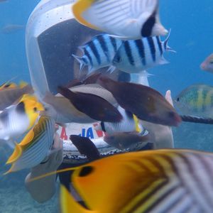 被るだけなのに髪の毛が濡れないなんて仕組みが分からなかったのですが、やってみて納得。大きなヘルメット?の重さが40キロですが水中では4キロと重さも感じないし水中ギリギリでインストラクターの方がこれまた水面ギリギリにヘルメットを持ち、そこに頭を入れる感じだったので40キロを体感する事も無かったです。水中カメラを持って行ったので魚を撮ったりとても楽しくて終わりたくなかったです♪インストラクターの方々もノリが良くまた利用したいです!