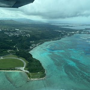 空から眺めるグアムの景色は格別です。珊瑚礁の海はもちろん、緑豊かなジャングル、スコールのカーテンも見えました。60分のフライトで、島を周遊し、地上からは行けないところにも連れて行ってもらえます⭐︎
