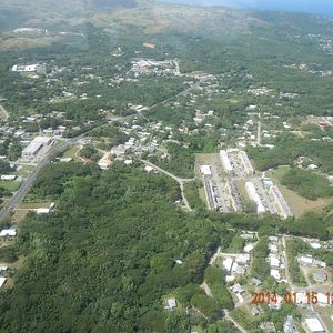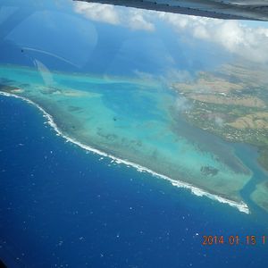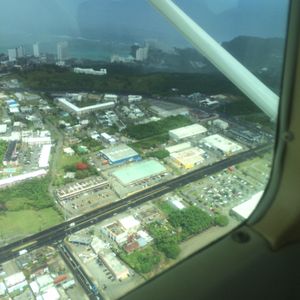 時間どうりにホテルへお迎え、きれいな車でPikUp.日本人の3人と相乗りでした。どこからセスナに乗るのかなと考えていたら、ガソリンステーションによりガス給油。オイオイ、前もって入れとけよと。ランパット空港に着き、警備小屋みたいなところでパスポートのコピーを渡し身元確認、確認後ワッペンを貰い胸に装着。また車で移動、民間航空の事務所に到着、すぐ外にはセスナ機が待機してる。ここで担当者の説明、勝手に外に出るな、テロ以降監視が厳しくなっている、滑走路では担当者の後ろについて歩けなど、ちょっと怖い説明を受ける。さて、いよいよ搭乗、パイロットさんがセスナをバックに記念撮影をしてくれた。サンキュー。セスナの中は想像以上に狭いしボロイ、内張りがハゲている。乗り込むのに一苦労。妻と息子が後部座席。いざテイクオフ、こいつ本当に大丈夫かな?と。飛び立ってしまえばあとは眼下の絶景。きれいな海、恋人岬上空でUターン、アプラ港海軍基地を遊覧して帰ってきました。タッチダウンのときは機体が右に左に揺れて、スリル満点、オーマイガー。それとセスナにはクーラーが無い。窓は閉め切り、サウナ状態。いい汗をかきました。日本国内でヘリコプターに乗ったこともありますが、こちらのほうがおもしろかった。お勧めです!!