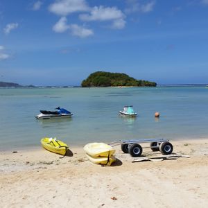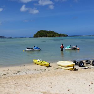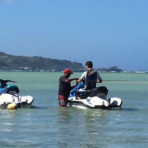 浅瀬で簡単なレクチャーを聞き、インストラクターのジェットに乗って沖に係留させてあるジェットまで行きます。沖までの間に岩場があり、浅瀬は危ないからだと思います。