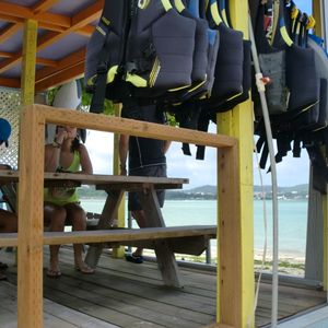 ツアーの場所はハガニア湾のホテルサンタフェのビーチになります。ホテルの脇に東屋があり、受付になっていていました。カギ付きロッカーも完備されています。真水のシャワーも簡単ですがありました。更衣室はサンタフェの物が使えます。障害者用多目的トイレのような作りです。