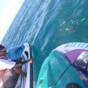 バイクにもほとんど乗ったことがないので、またがって滑走する感覚はとても新鮮でした。最初は波を切ってジャンプする恐怖に、背後の同乗者には嬌声であるかのごとくカムフラージュしつつも、思わず悲鳴が出ましたが、だんだん慣れてくるとそれも楽しくなり、ついには鼻歌まで口ずさむ余裕が出ました。インストラクターは背後に良く注意を払い、スピードを調整してあまり離れないようにしてくれました。イルカが泳ぐポイントに連れて行ってくれて、すぐ足下にたくさんのイルカが泳ぐ姿を見ることができました。往復16kmのツアーはちょうど良いサイズです。操縦中の動画や写真を撮ってくれて30ドルという納得の価格で売ってくれます。これを買わない客はいないでしょう。