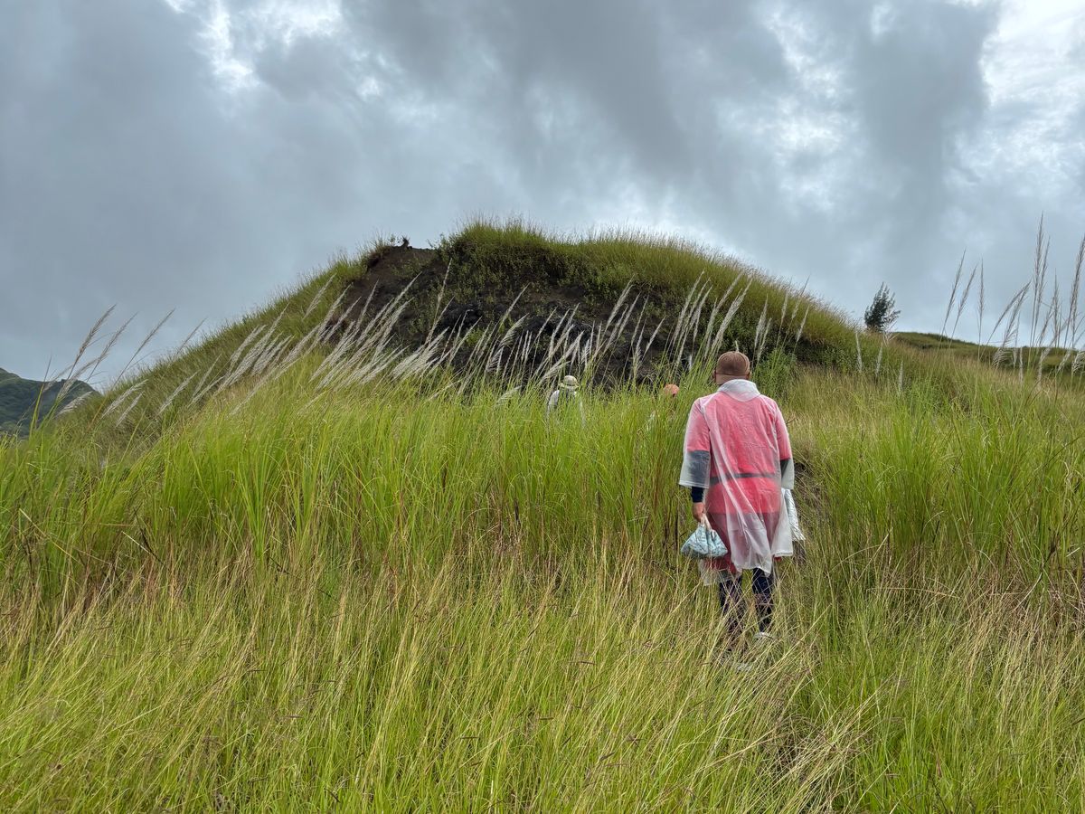 曇り時々雨のあいにくの天気でしたが、メインイベントのハイキングの時にはどうにか止んでいて、無事に歩けました。雨模様なのでカッパを貸してもらいました。