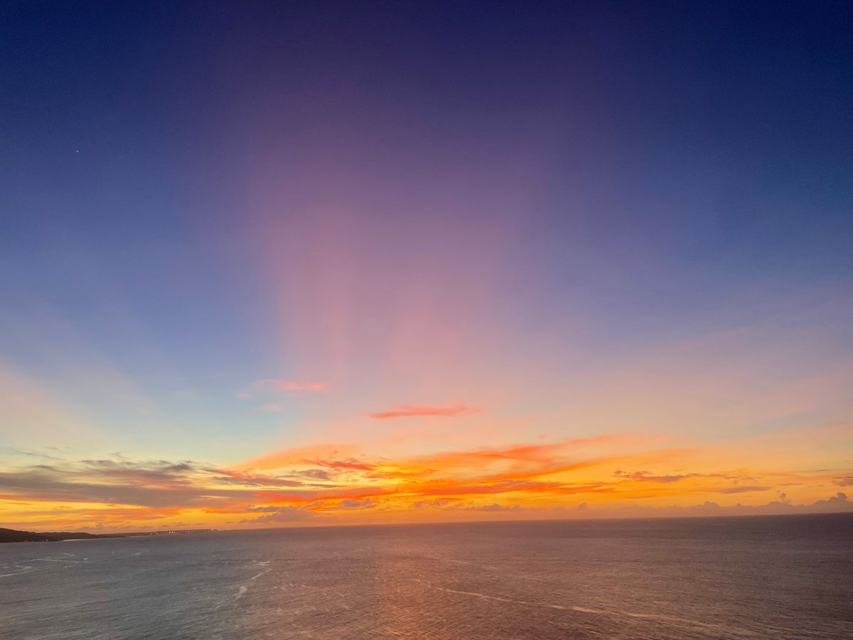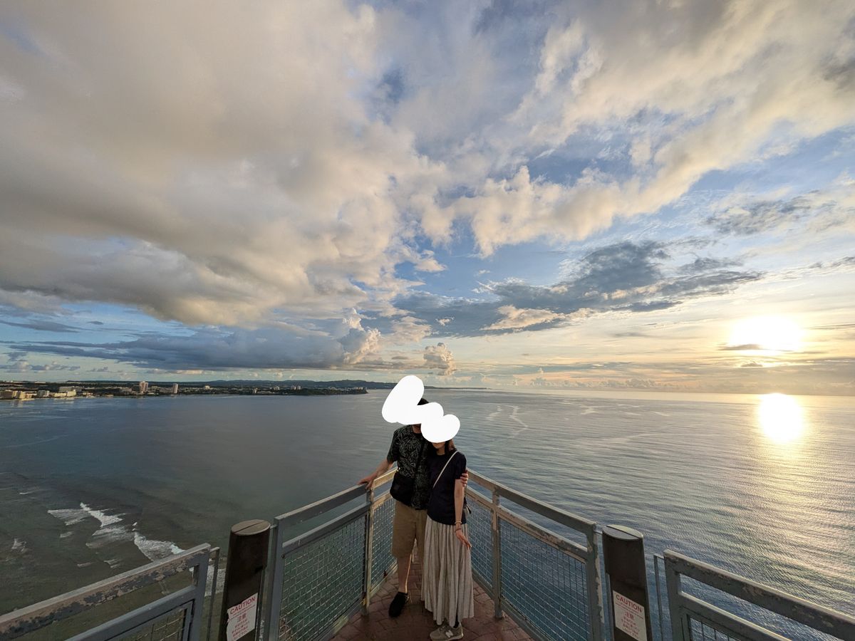 結婚式を挙げた夜に来て以来の夕日観賞、水平線に雲が有り日の入りは見えませんでしたが、その後のマジックアワーは 初めて見たとても幻想的で感動でした。ガイド堀田さんの日本人らしい気遣いや、GUAMの説明、カメラマン役等、至れり尽くせりの時間を過ごせました。今回の旅行の一番の思い出です