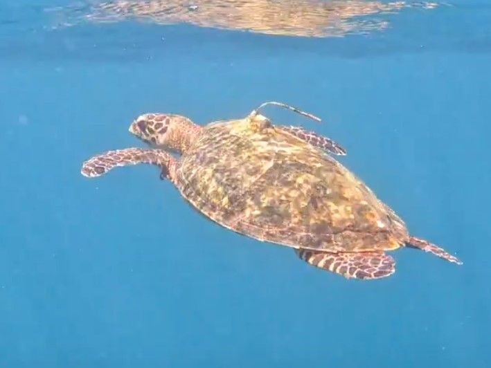 アンテナがついているカメはグアム大学が行っている生態調査のために取り付けられたものです。