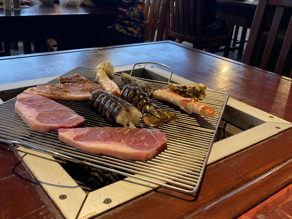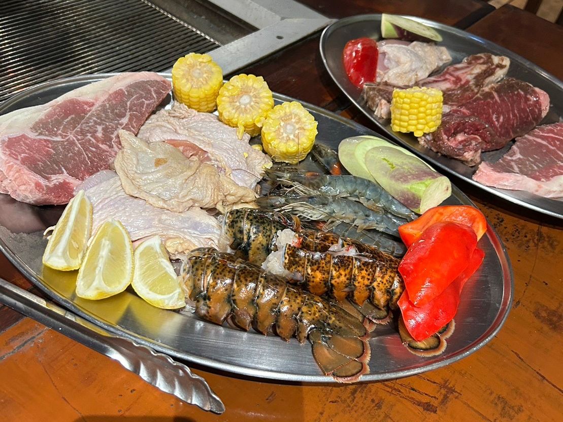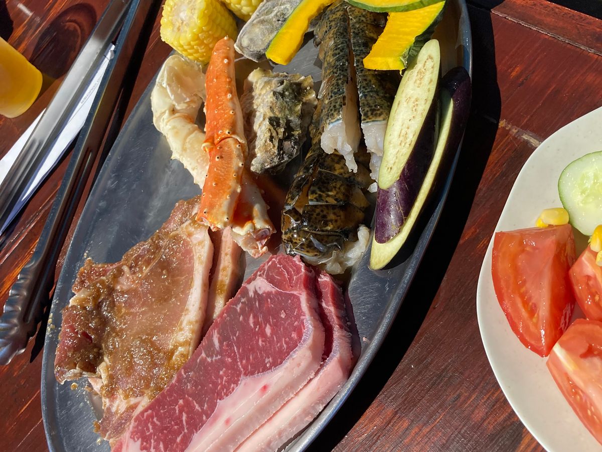 BBQのメニューは、一人当たり肉2枚、ブロックチキン、冷凍牡蠣、カニの足、身が付いていないロブスター。薄くカットしたかぼちゃ、ピーマン、とうもろこし、茄子。フリーのサラダは良かったが、フリードリンクといえどもアルコールは缶ビールだけ。紅茶と水は無料。このお値段ではこのメニュー