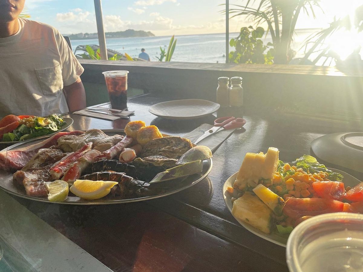 バーベキューは、種類が多くて美味しかったです。ドリンクは、注文制ですが、なかなか注文に寄ってくれず、また、注文した後、心配になるほど飲み物が来ませんでした。ショーは、思ったより良かったです。特に素人飛び入り参加が上手くて感心致しました。イベント会場は、夕日が美しく自撮りの観光客の多さに唖然としつつ、娘と2人グァムの美しさを堪能していました。