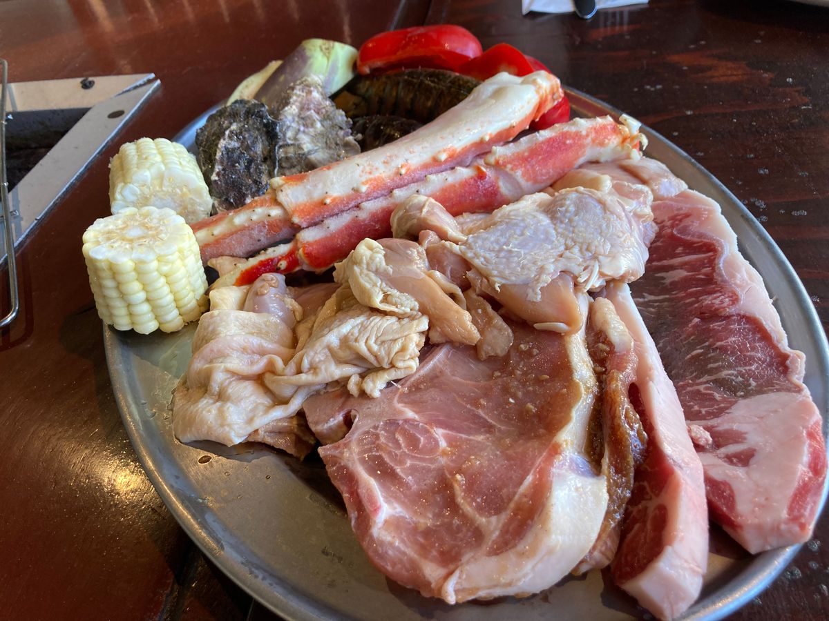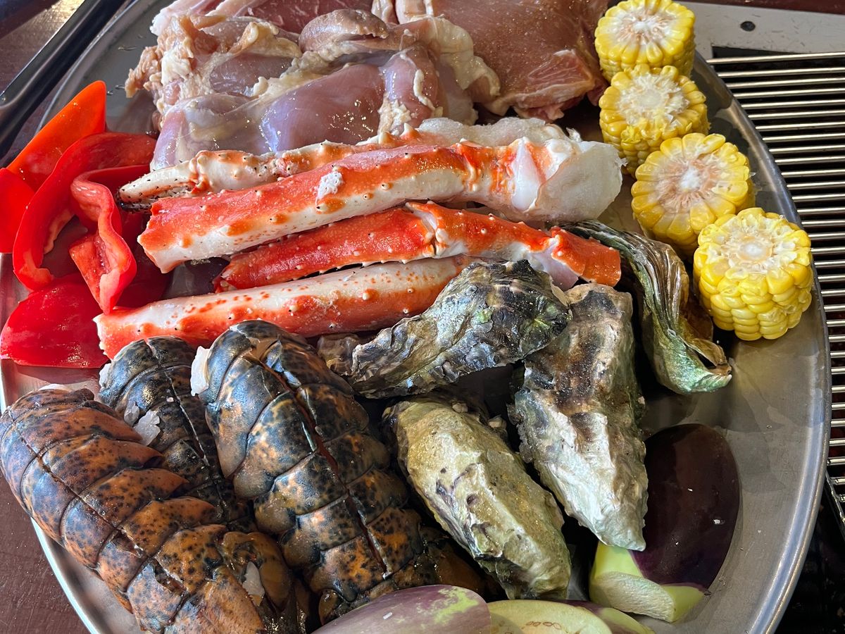 食材はお肉や海鮮など盛りだくさんで、食べきれないほどです。野菜、ご飯、味噌汁、フルーツは食べ放題です。ビールと一部のソフトドリンクも飲み放題!