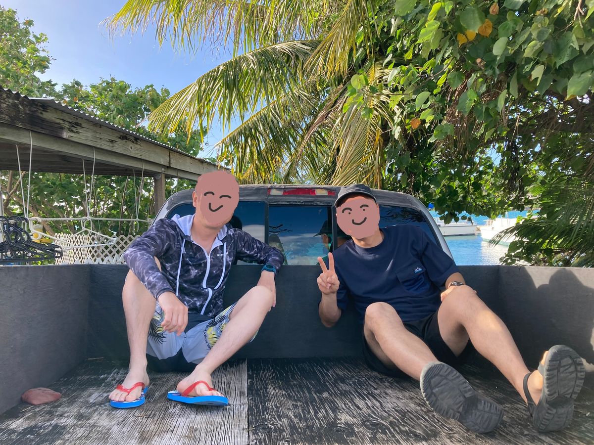 ハウスからビーチまではピックアップの荷台に乗っていきました。これは、グアムでは合法ですごく楽しかったです。アメリカを感じました。
