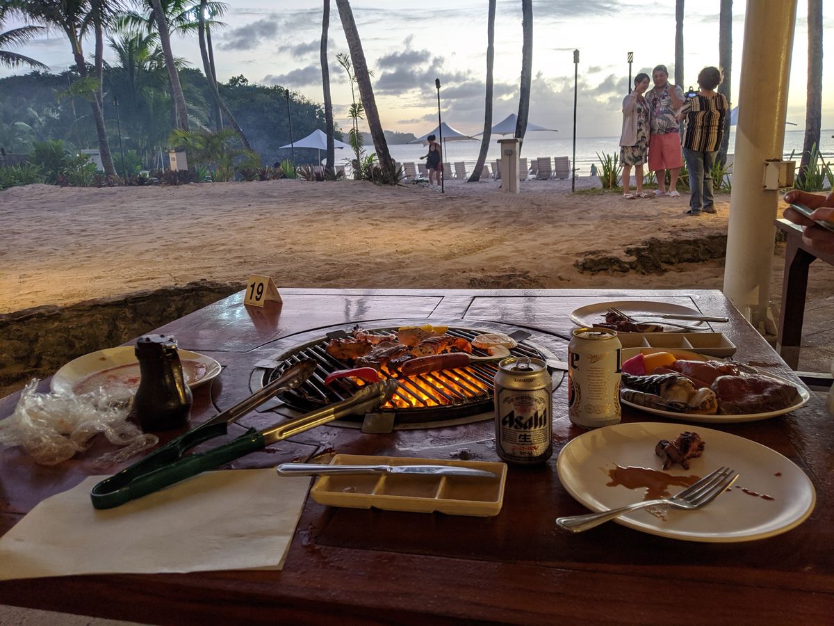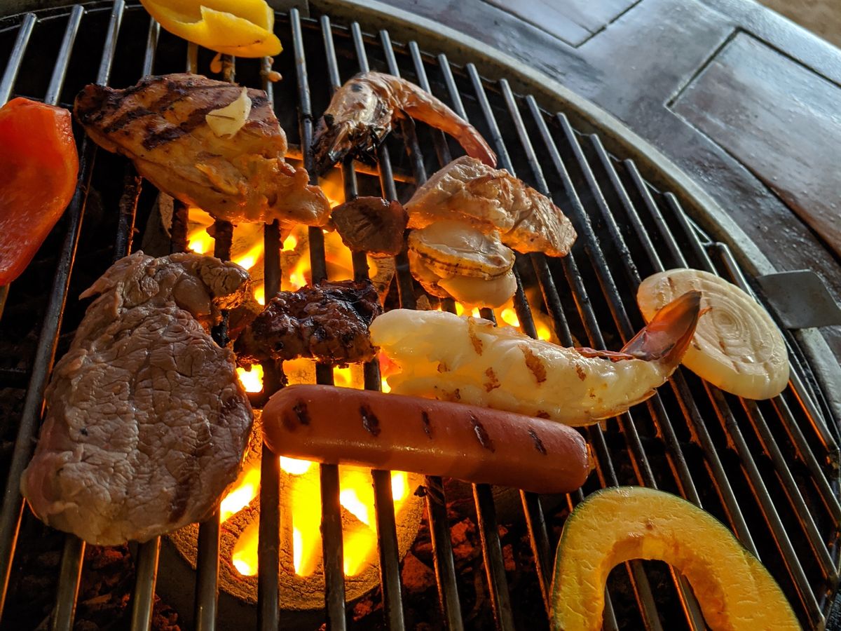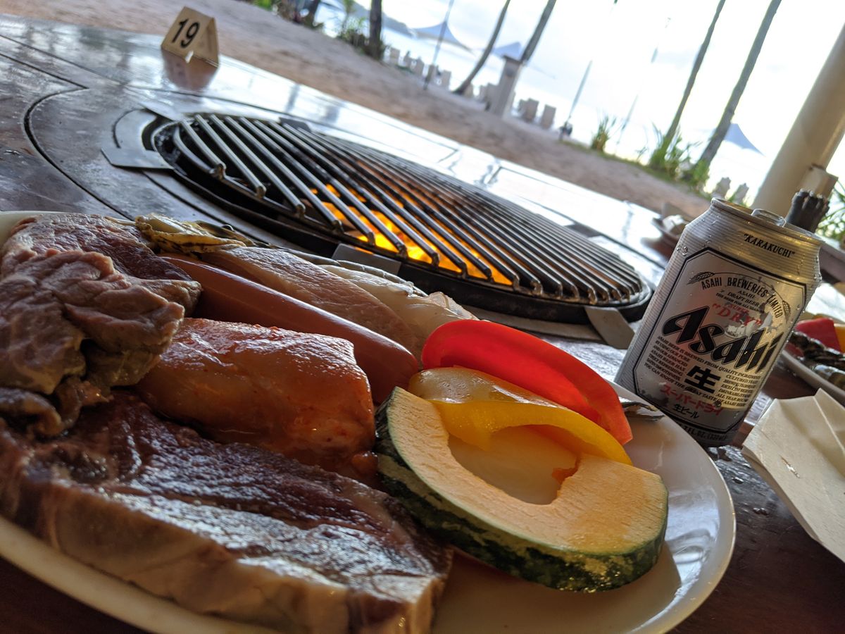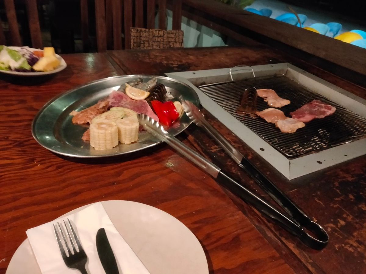 食事は、骨付きカルビやロブスター、野菜などが最初に準備されており、サラダやフルーツ、白米などはブッフェ形式で別途取りに行く形式です。ブッフェにはジャガバターやキムチ、素麺などもありましたが、席に準備されていた食事で充分お腹いっぱいになる量でした。