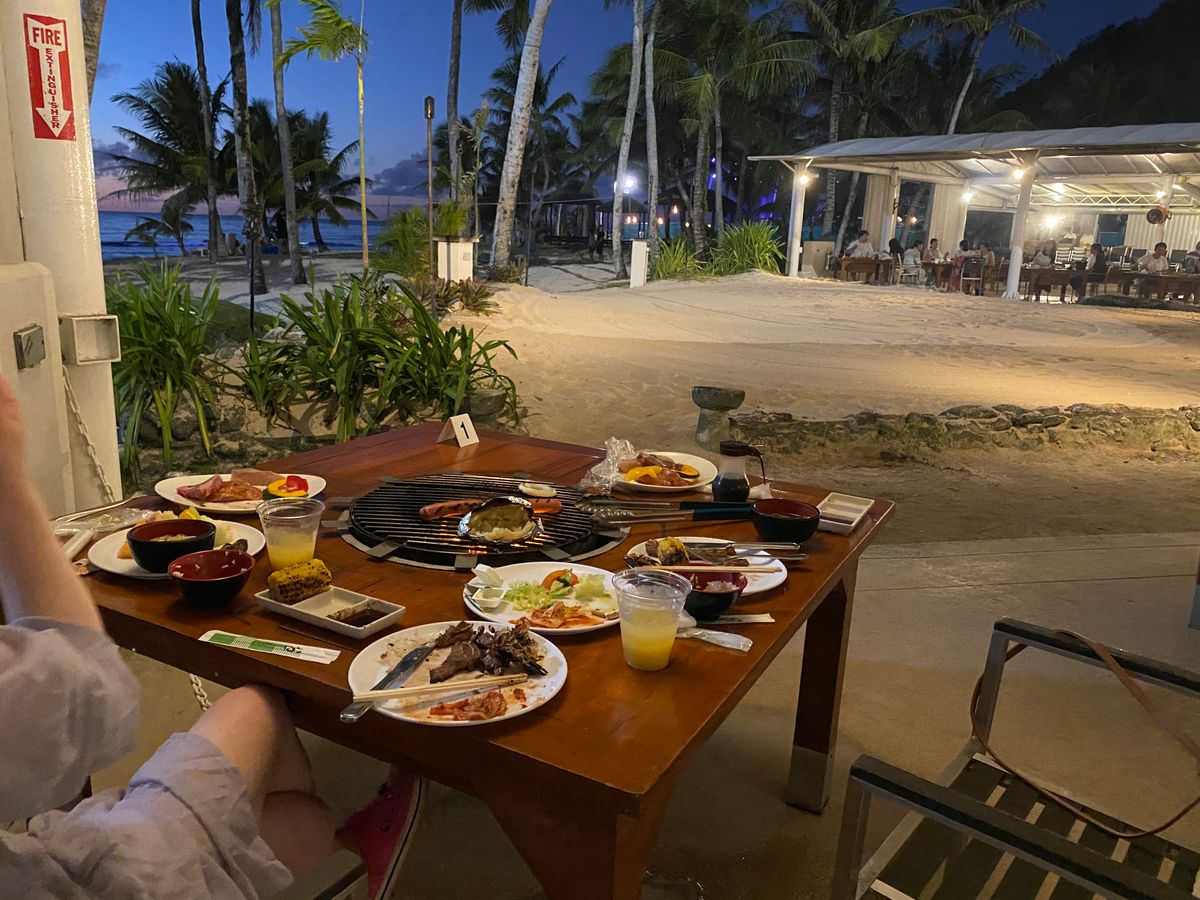 会場に到着すると丁度夕陽が綺麗に見えていました。食事の前に写真を撮ったり夕陽を眺めたり有意義な時間を過ごすことができました。その後席に案内されBBQ開始しましたが、まだ夕陽が見えていて食事しながら日が沈んで行くのを眺めることができました。食事を楽しんでから1時間半後くらいにショーが始まります。参加者もみんなで踊ったりと最終日に最高のディナーを過ごすことができました。
