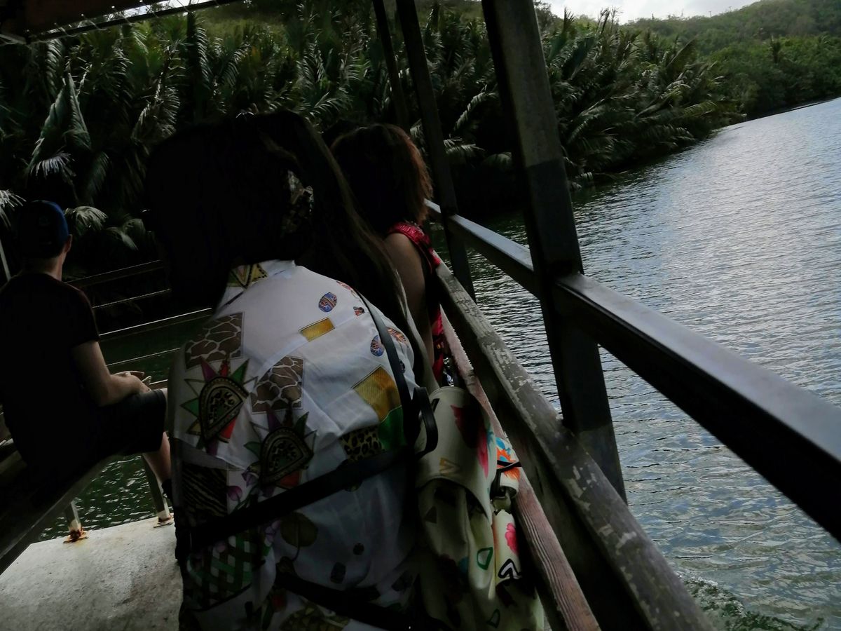 乗船人数は20人ぐらいで、9割日本人観光客、残りがアメリカの方でした。船が動き出し、川をどんどん進むと魚や蟹が見え始めました。途中でガイドがイグアナを見つけ船が止まったため、わたしも見に行こうと船の中を移動しようとしたところ、アメリカの小さいお子さんが通路の真ん中にいました。その子が退いてくれるの待ってイグアナを見ようとしたらちょうど逃げてしまい肩を落としていたら、日本語ガイドが「日本人はクソだ」「日本は1時間の時差があるから、動きが鈍いんだ」と差別ともとれる発言をしました。ひどくびっくりしました。なんでそんなこと言われなきゃいけないんだとモヤモヤが止まらなくなってしまいました。そのあと船を降りて、チャモロ族の格好をした現地人と一緒に写真撮影をしたのですが、この現地人の対応も最悪で、2枚撮った写真のうち1枚は目線が合っておらず、もう1枚は親指を下にしたグーのポーズ…観光客を相手にした対応はこれでいいのでしょうか?目線が外れてしまったのはまだいいけど、親指を下に向けるのはどうなんでしょうか?このツアーの写真を見返す気分にはなれません。