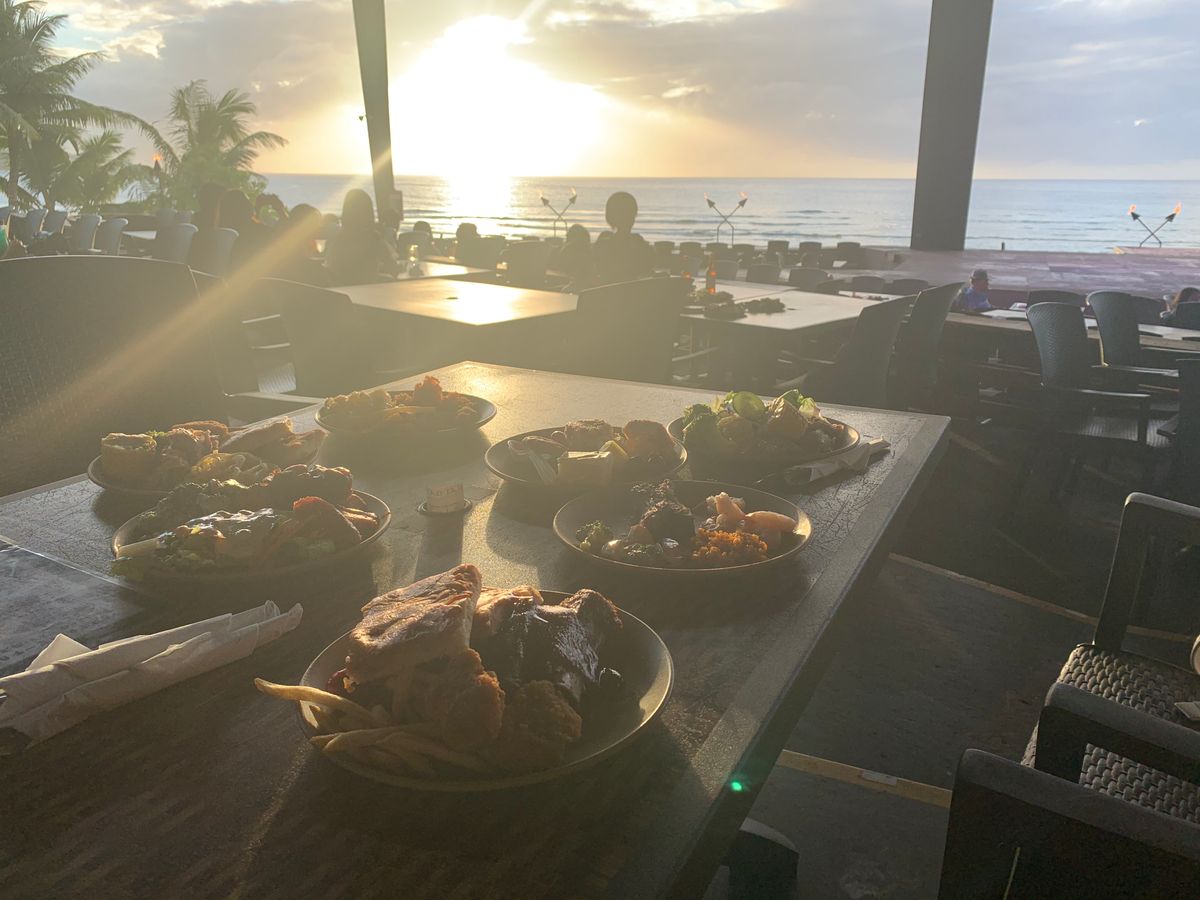 食事会場前のビーチはとても綺麗な白浜で、席についた時間がとてもタイミングよく、夕陽が沈んでいく様子を眺めることもできました。