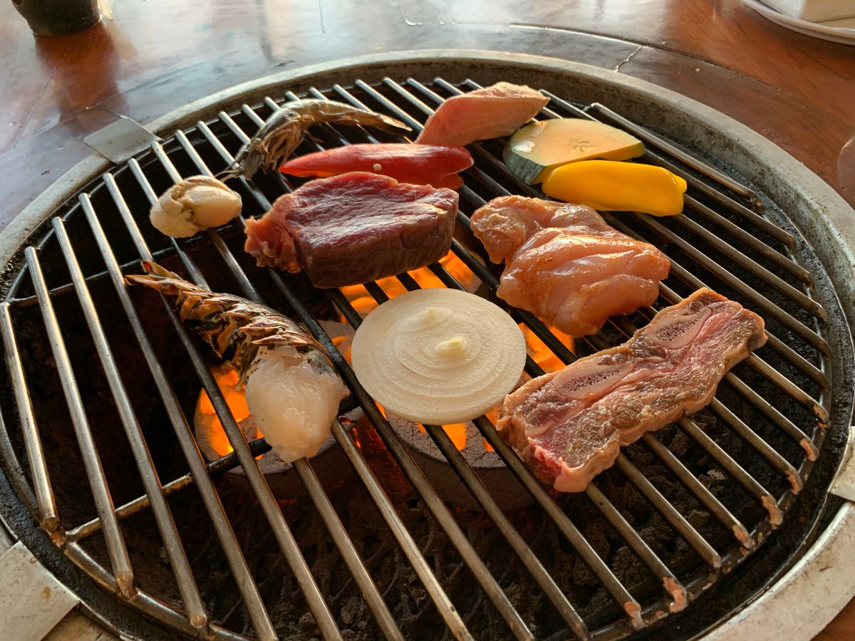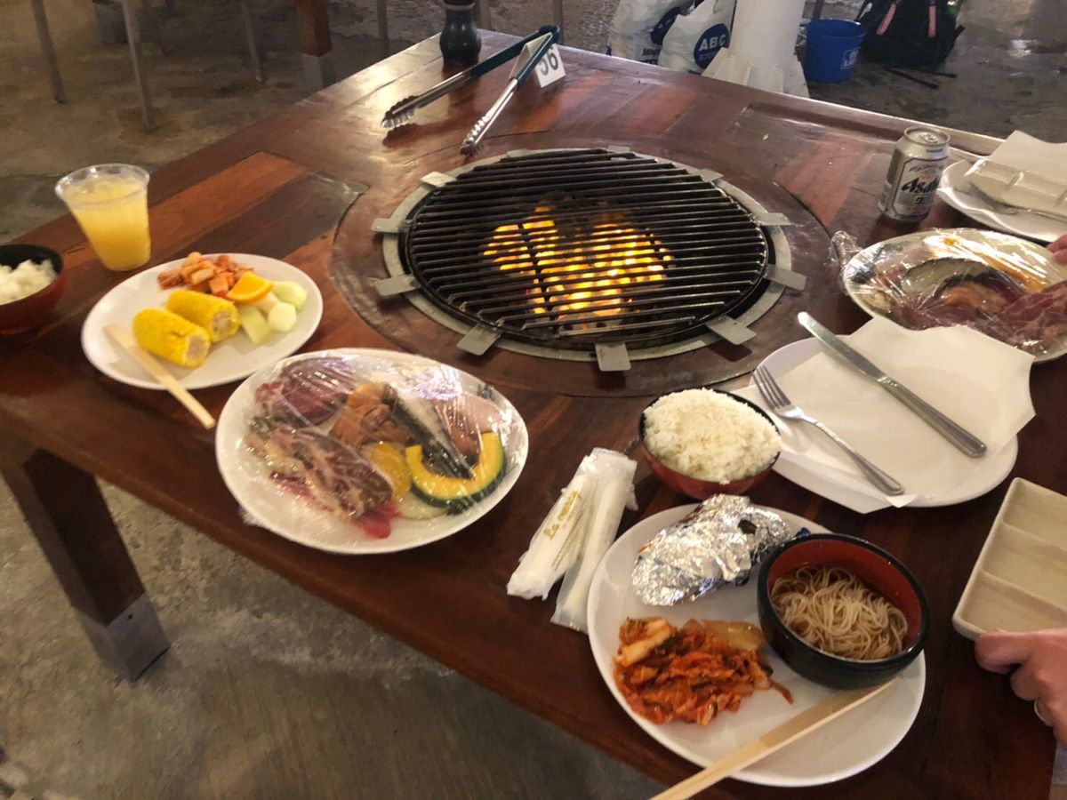 席には食べきれないのでは?と思うほどの、お肉、海鮮が用意されており、飲み物と追加のご飯やたれ、フルーツなどはセルフでした。