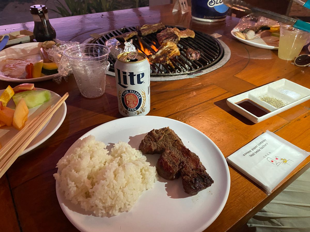 会場に着くと、宿泊ホテル名と部屋番号を聞かれ、予め決まっているテーブルに着きました。早速BBQが始まりますが、初めのワンプレートは魚介、肉、野菜が付いており、その後は肉のみ追加注文可能。サラダやご飯はバイキング型式でした。飲み物は缶ビールが飲み放題ですが、残念ながらあまり冷えてなかったです。