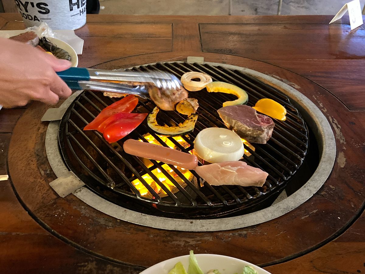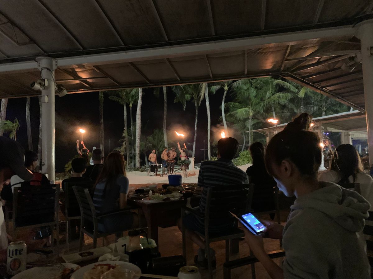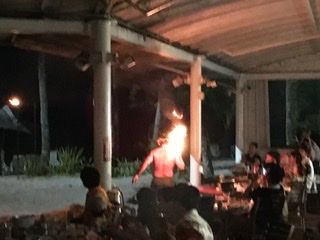 席もたまたま一番前で夕日とヤシの木の景色が最高に綺麗でした。3.40分ほど食べていると、ショーが始まりました。ダンスや火を使ったやつは迫力がすごくてずっと動画を撮っていて、見惚れてしまい、焼いているのを忘れてしまいそうだったので早めに焼き切ることをお勧めします笑