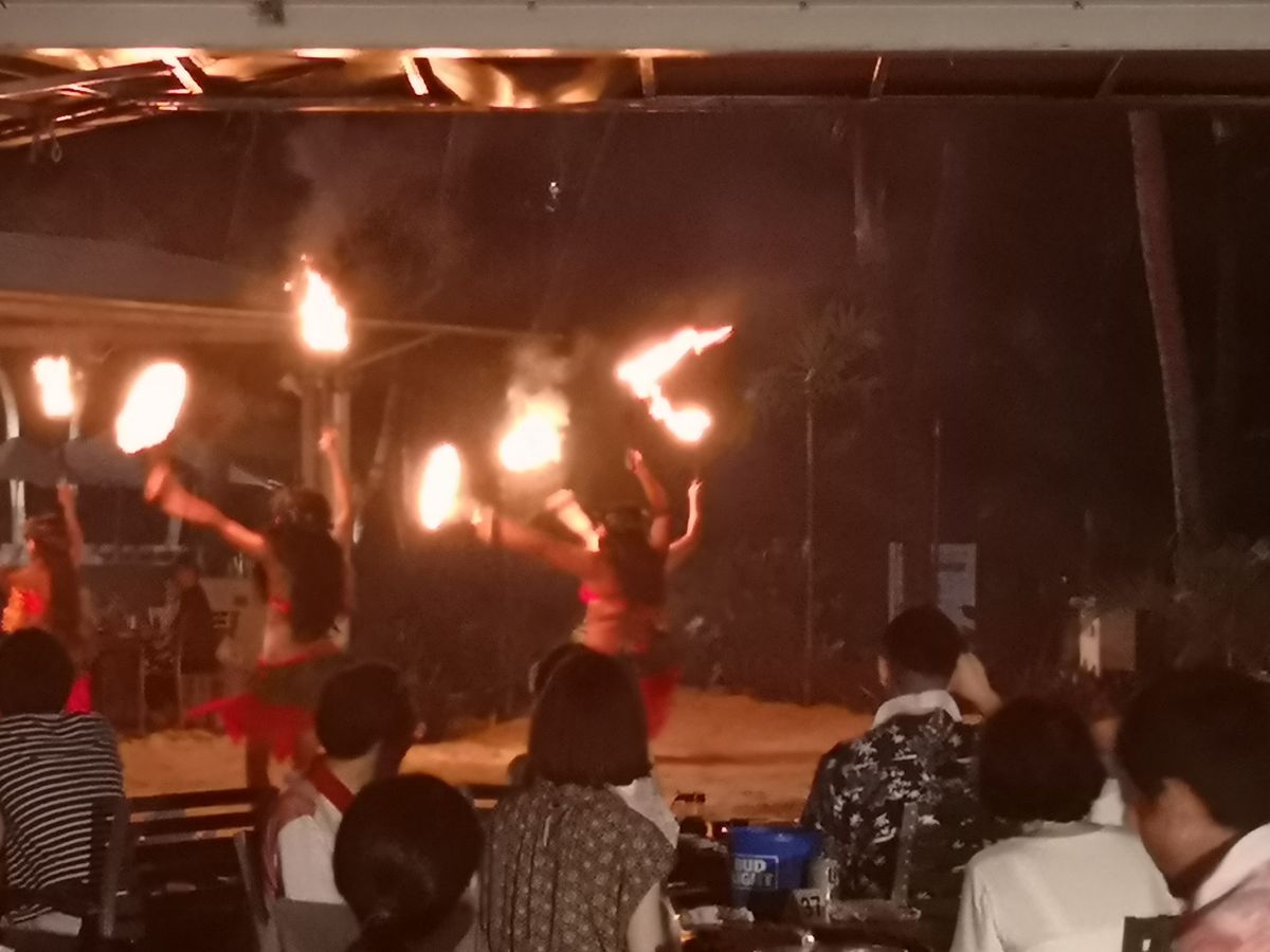 海辺のたいまつと夕陽のコラボが素敵で、食事も美味しく、ショーは力強さ有り、笑い有り、美しさ有りと、楽しいひと時はあっという間でした。