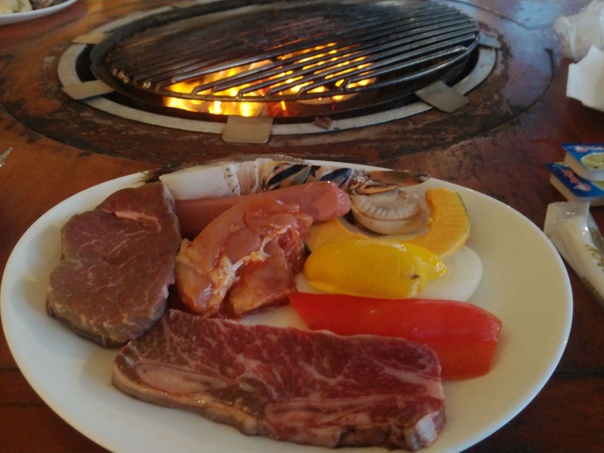 テーブルには、サーロイン、骨つき牛肉、鳥肉、ウインナー、野菜がお皿に入っていました。