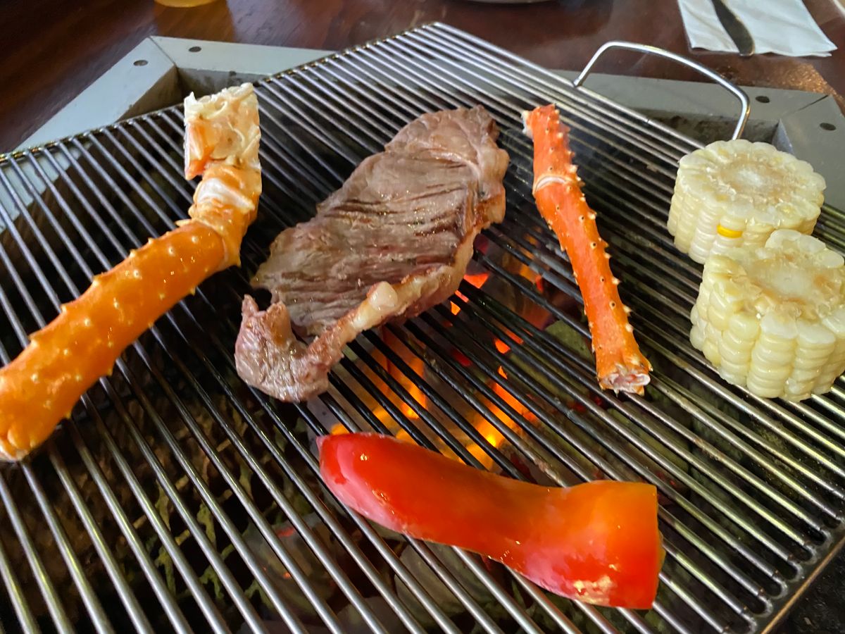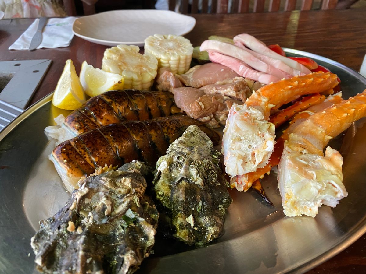 家族4人で行きました。量が一番少ないコースを予約しましたが、小食一家だということもあり、おなかいっぱいになりました。肉もシーフードもおいしかったです。何より海に沈む夕日がとてもきれいでした。